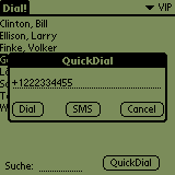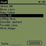 After launching Dial!, you look at the familiar view of the internal Palm-Addressbook. Like in the internal Addressbook you have a search function and the possibility to switch the categories. |