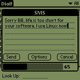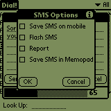 With the SMS feature of Dial! you can send SMS messages up to 160 character. A progress bar and a counter shows you the remainig space for the message. In the edit field you can use the normal Palm Copy-, Paste-, etc. functions. You can write your SMS messages offline. A IRDA connection will only be established when you click on the 'Send'-button. At this time latest, you have to switch the IRDA receiver on. |